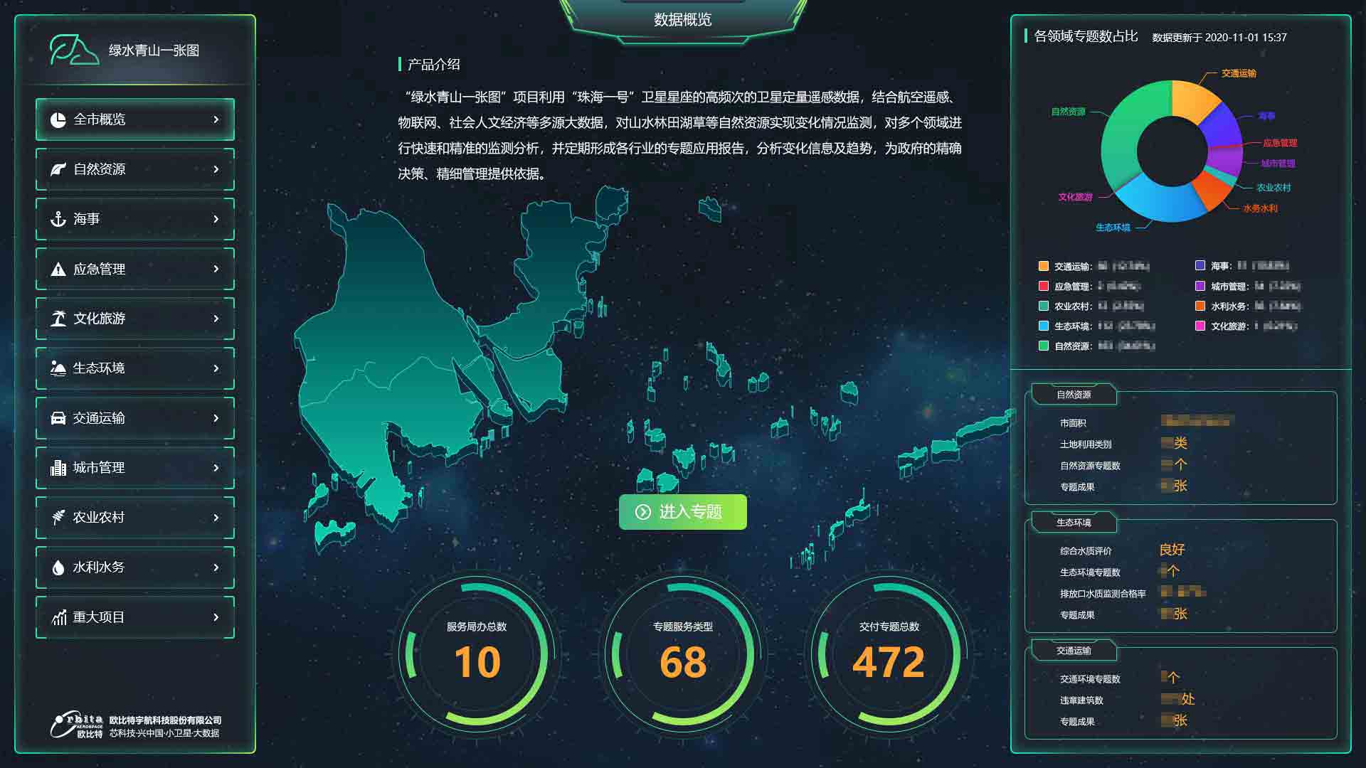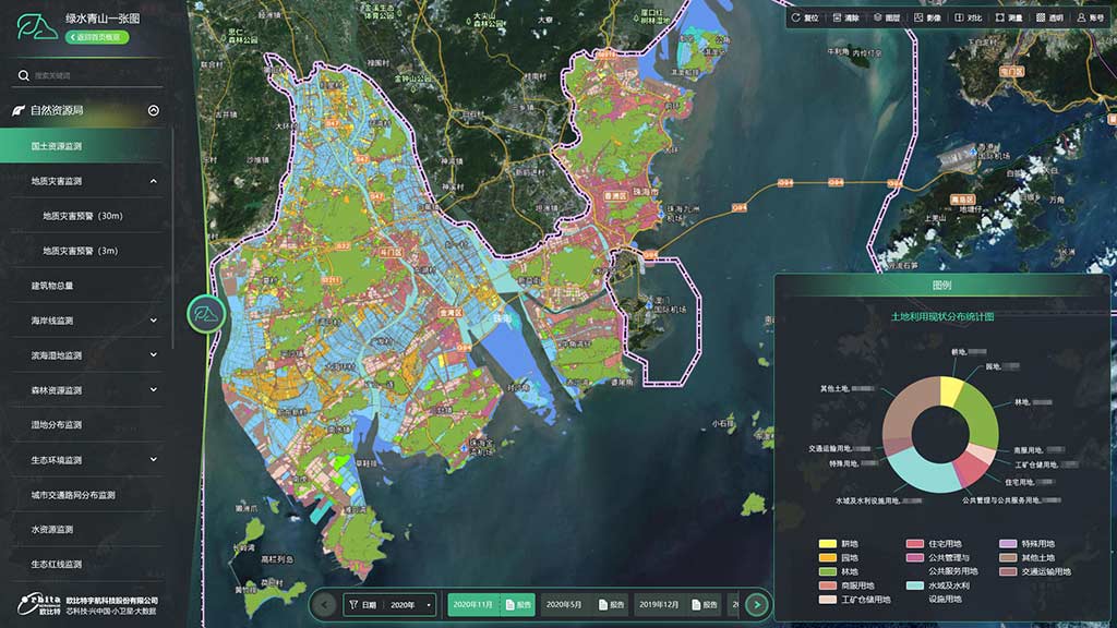 基于卫星遥感大数据、人工智能及数字政府为一体的“绿水青山一张图”服务平台,瞄 准自然资源、空间规划、国土资源、城市管理、环保、林业、精准农业、海洋、防灾减灾、乡村建 设、智慧交通等应用领域,以“数字可共享、运营智慧化、数据中心化、业务全覆盖”为四大目 标,结合“珠海一号”卫星星座数据采集的优势,形成以数据采集、大数据处理和人工智能决策支 持为核心的“绿水青山管控决策支持系统”。该系统将是现有数字政府业务系统的有力补充,能与 其有机融合,实现以信息化带动城市管理现代化,以准实时、高光谱、多波段的卫星大数据促进 “数字经济”发展,提供有效的政府管控及领导决策支持服务。